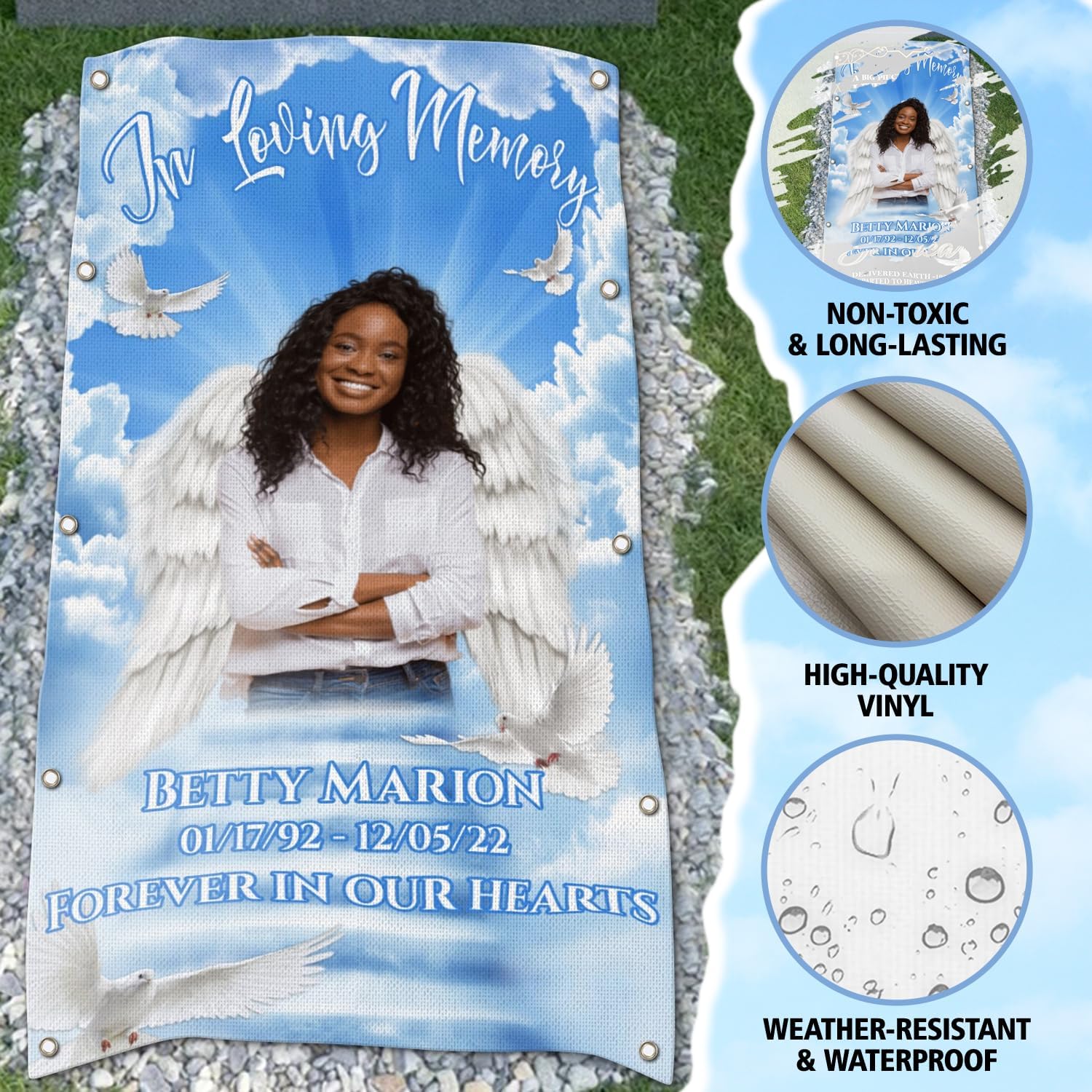 • 【HIGH QUALITY MATERIAL】MadefromHeavy Duty 14 Oz Vinyl;weather-waterproof and UV resistant material.Durable outdoor use; It can last through all seasons(possibly longer).Our custom memorial grave blankets DO NOT INCLUDE ROCKS/STAKES OR ACCESSORIES.
