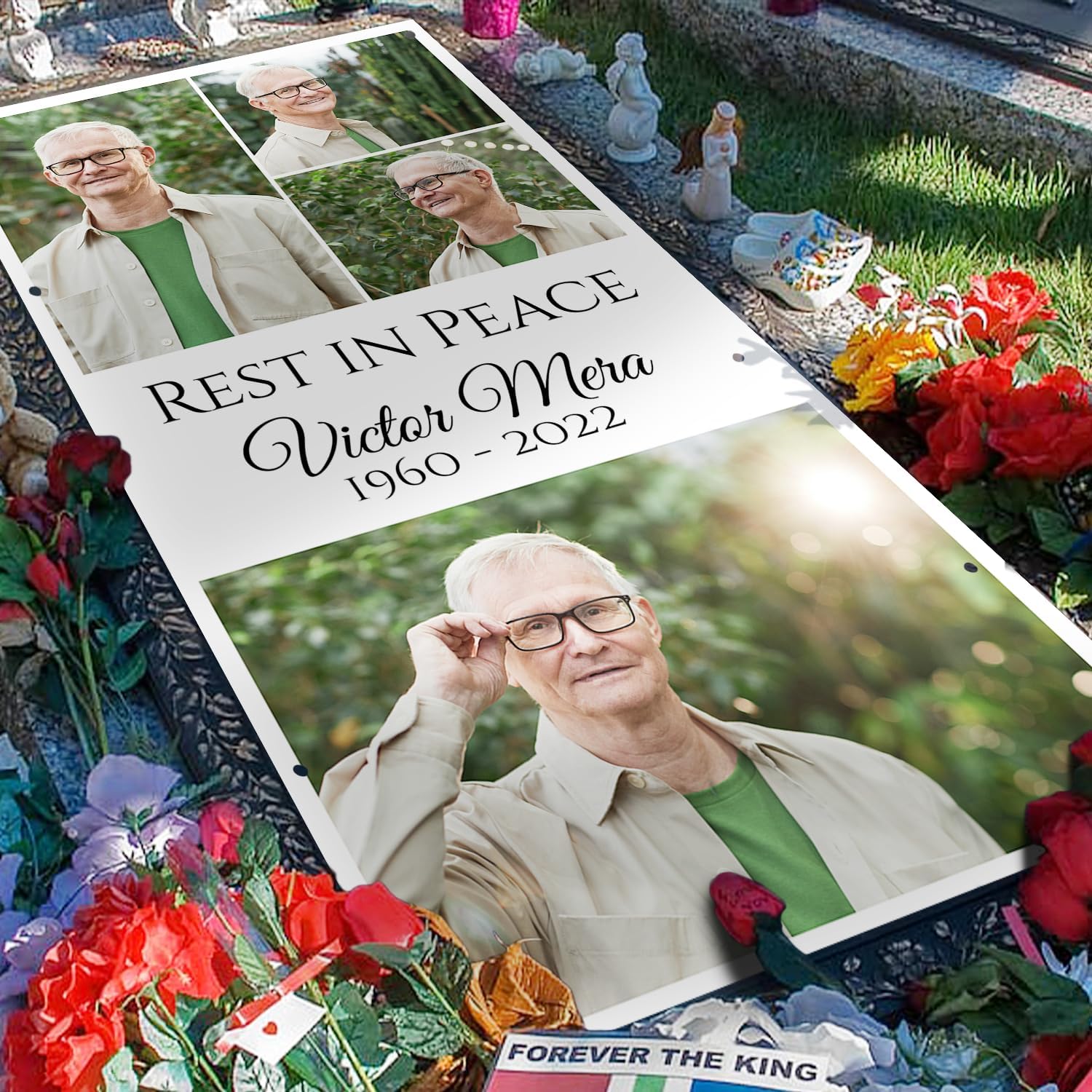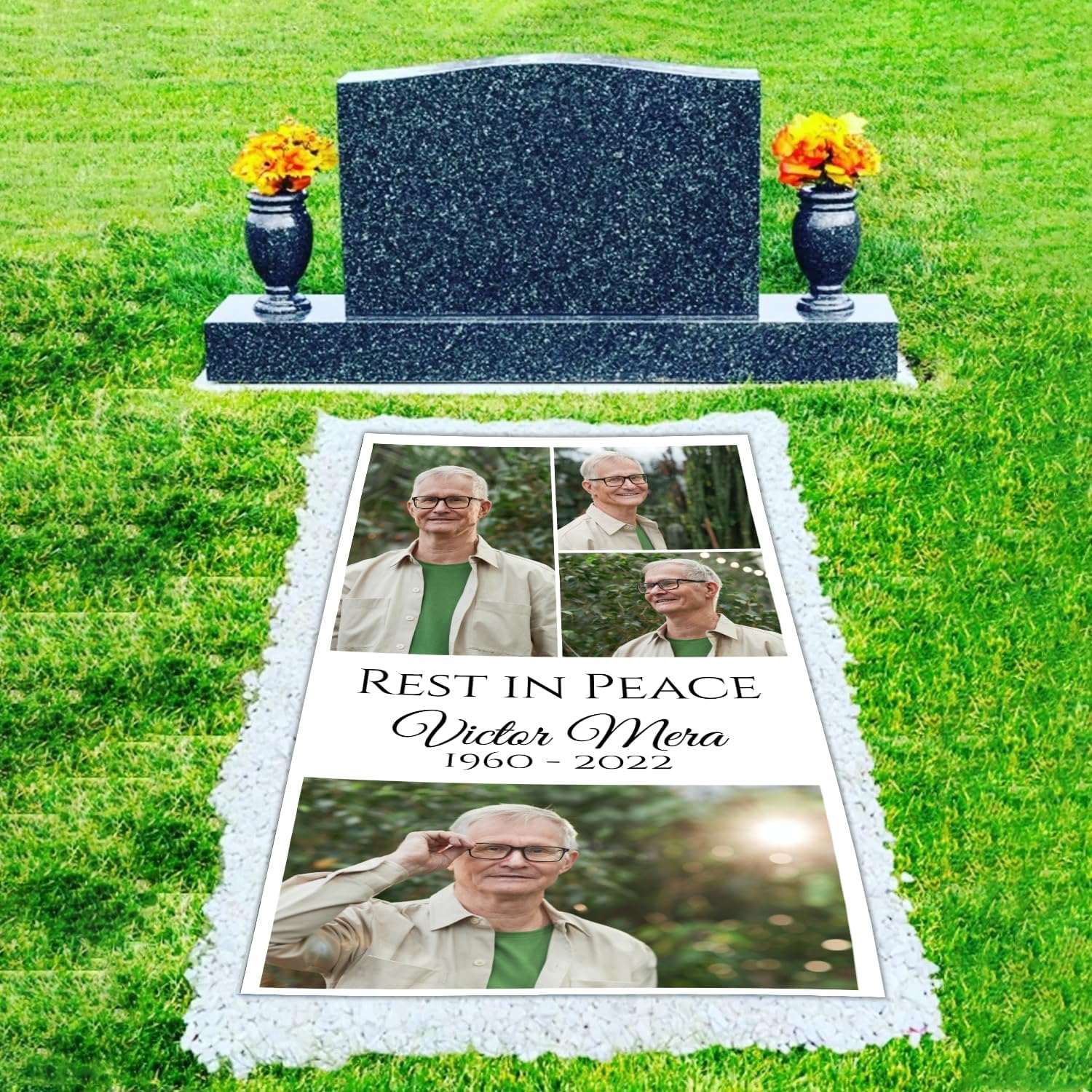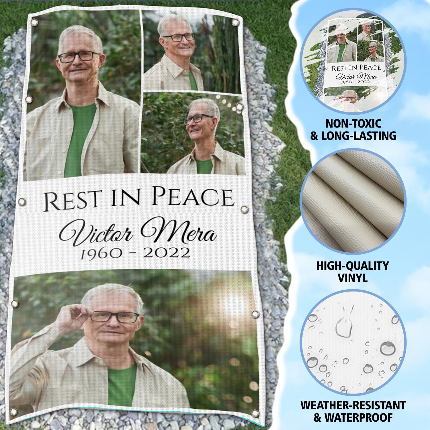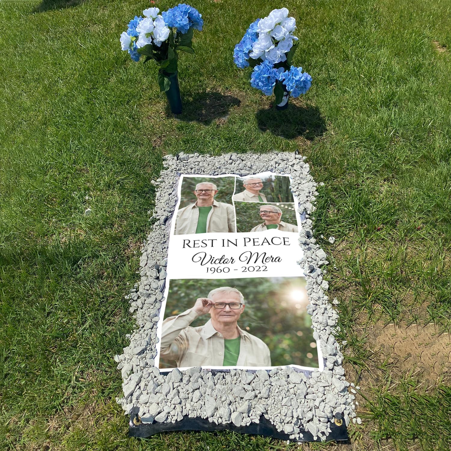 • 【HIGH QUALITY MATERIAL】MadefromHeavy Duty 14 Oz Vinyl;weather-waterproof and UV resistant material.Durable outdoor use; It can last through all seasons(possibly longer).Our custom memorial grave blankets DO NOT INCLUDE ROCKS/STAKES OR ACCESSORIES.
